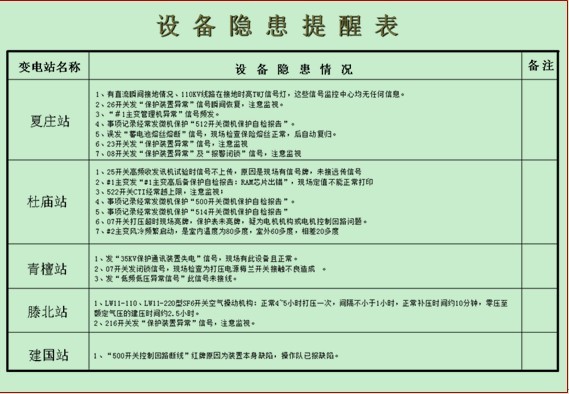 2.1 設(shè)備隱患提醒表:匯總變電站存在的異常信號,且在短時間內(nèi)無法處理的隱患(例如:滕北站發(fā)“216開關(guān)保護(hù)裝置異!卑l(fā)后隨即復(fù)歸,檢修部門無法捕捉檢查)。監(jiān)控值班員在監(jiān)控過程中,可以通過此表跟蹤并加強(qiáng)監(jiān)視,及時匯報,提高值班員的判斷能力。