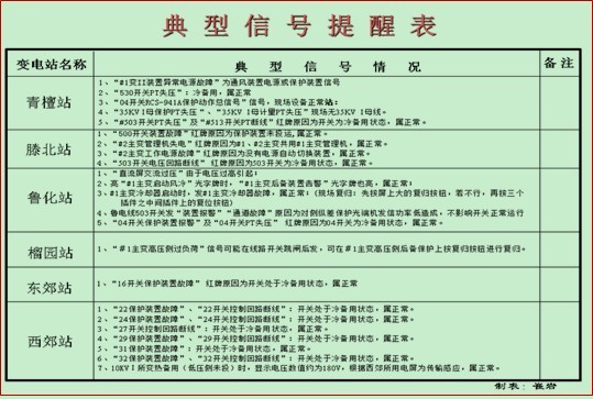 2.2 典型信號提醒表:此類信號并不是設(shè)備異常信息,但在工作中會時不時的發(fā)出,在判斷上容易產(chǎn)生誤導(dǎo),為了避免不必要的精力支出,我們將這類信號匯總提醒值班員。例如:220KV開關(guān)收發(fā)信機(jī)動作信號、備用開關(guān)的異常信號等都可以通過此表來排除,加強(qiáng)設(shè)備巡視與監(jiān)控質(zhì)量。